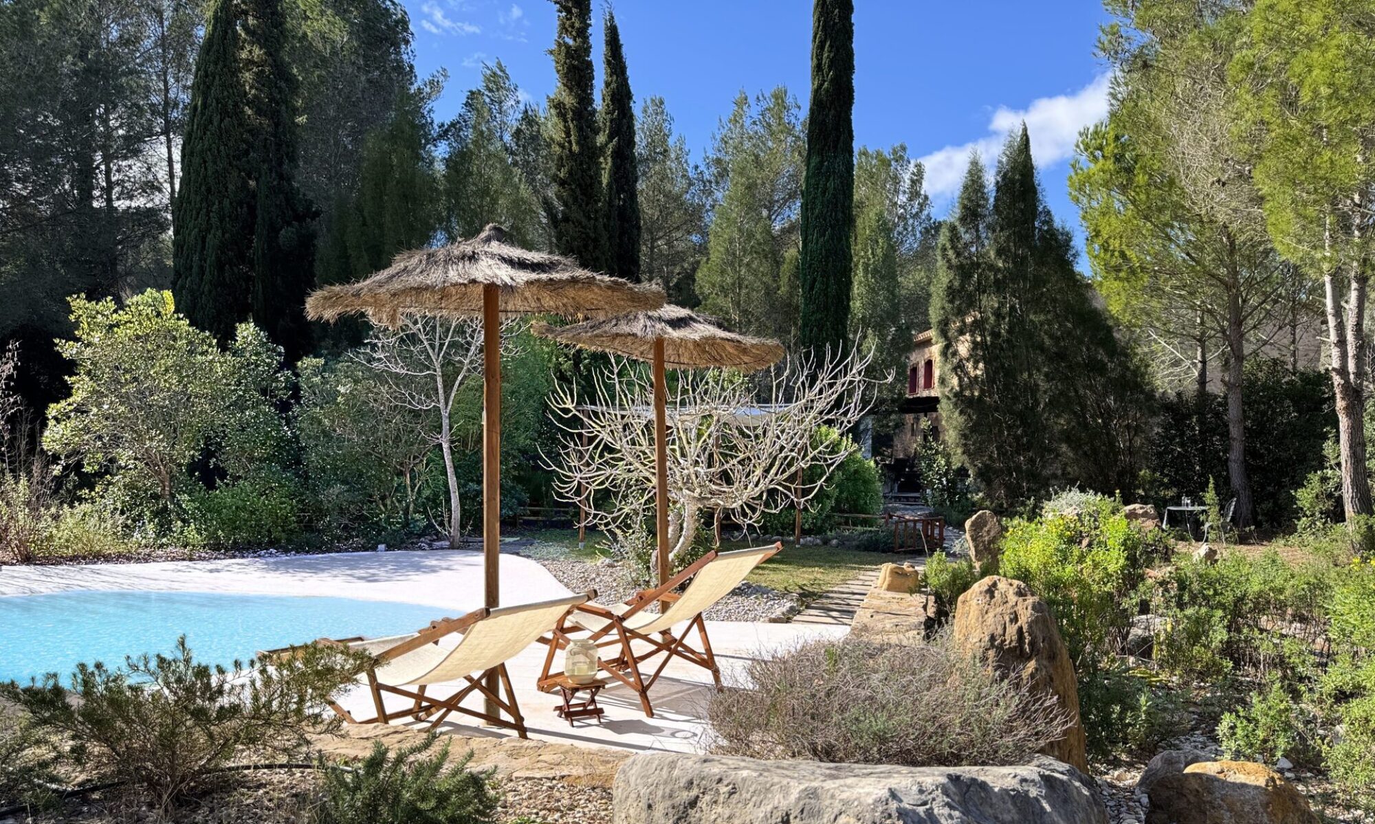 Cada uno de los rincones de este jardín es un regalo para los sentidos… Y en el centro, como un corazón del que irradia la vida, descubrimos la piscina… con un diseño inspirado en la obra del artista César Manrique…